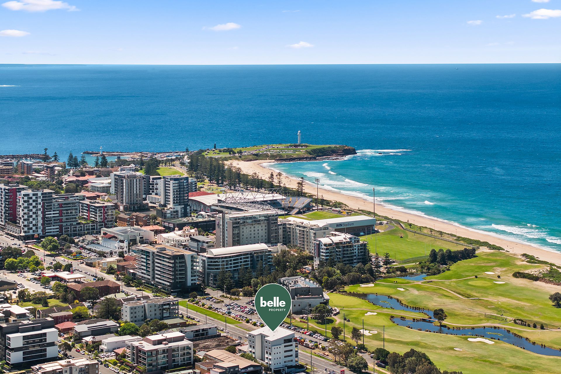 Directly opposite the acclaimed Wollongong Golf Club and welcoming a spectacular unobstructed 180 degree seascape from its 4th level vantage, this spacious modern apartment with a full length covered balcony feels privileged and private. Featuring floor to ceiling glass amplifying the exceptional outlook, step inside and discover open plan living connecting via stacker doors to generous outdoor entertaining, a stylish contemporary kitchen including stone benchtops and quality appliances, and 2 ample carpeted bedrooms, each embracing outstanding ocean views. A stone's throw to Wollongong Golf Club and level 500m stroll to the water's edge at Wollongong Beach, the City's vibrant arts precinct is just 600m from home, as are the diverse dining options along Crown and Corrimal Streets. - Wide full length covered balcony captures unimpeded ocean views - Open plan living features attractive engineered timber flooring - Stacker doors allow for creation of the ultimate entertaining space - Kitchen includes stone benchtops, gas cooking, and dishwasher - Bed 1 features walk-in robe and ensuite with marble-top vanity - Carpeted bed 2 with mirrored built-in robe enjoys access to balcony - Combined bathroom/laundry includes spa bath and rain shower - Air conditioning plus gas point for additional heating, linen press - 2 secure basement parking spaces with large lockable storage cage - Audio visual intercom entry to building, fob-controlled lift access