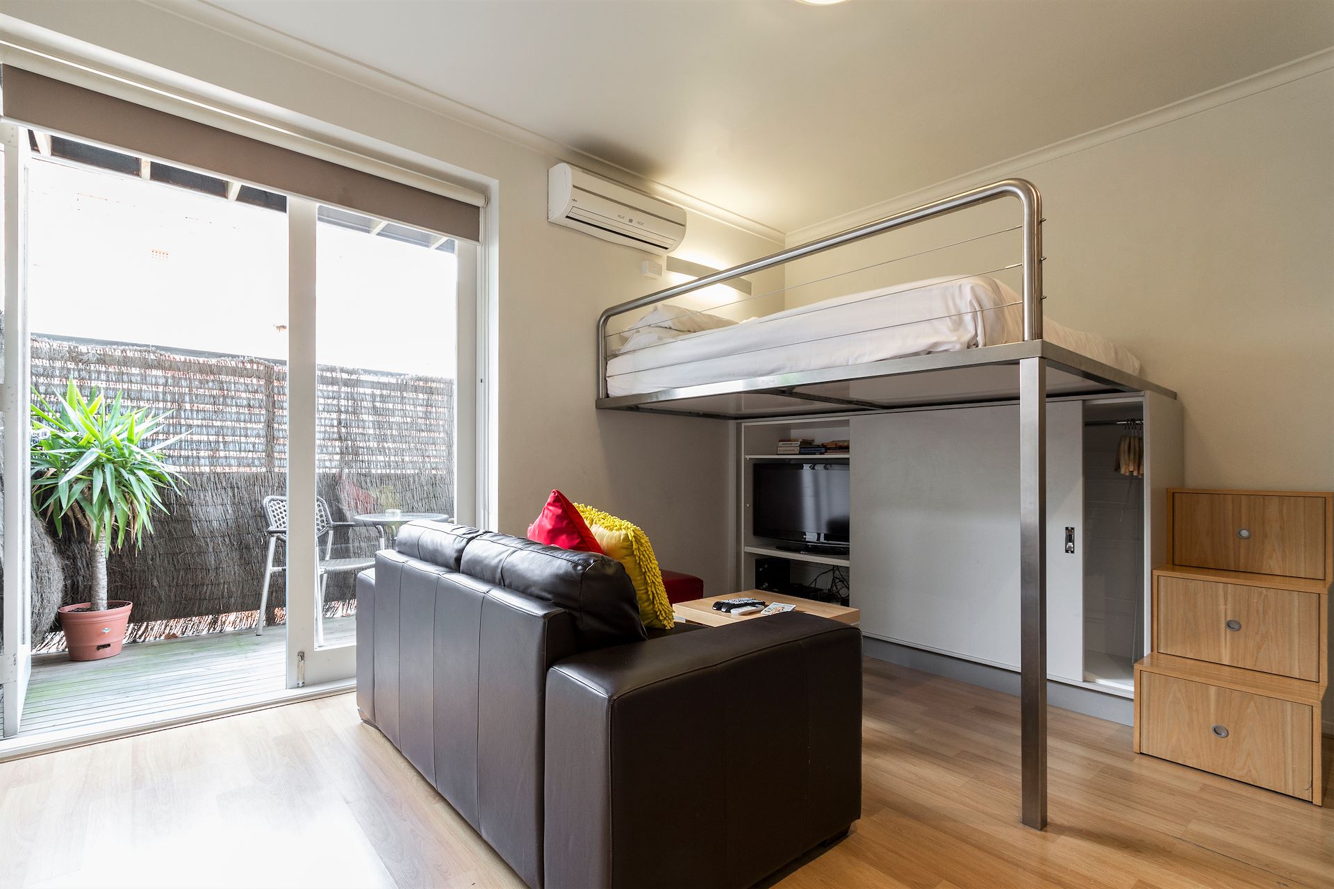 This 1st floor Studio Apartment has the lot. Gallery kitchen with cook top, mezzanine Queen size bed area and private balcony. To keep things comfortable the apartment has air conditioning/heating and a communal laundry on the same level. The property does not have an oven however a convection/microwave oven can be purchased for under $300 from most major electrical retailers. Location and Area Located 5 km from Melbourne CBD, St Kilda is a vibrant, beach side cosmopolitan suburb. Located at the "Paris" end of Acland St you are a short stroll from the beach, cafes, restaurants, shops, transport and entertainment. The Beach house on Acland St is close to all amenities whilst having the benefit of being in a quiet location close to Fitzroy Street. Rental: $250 Per Week