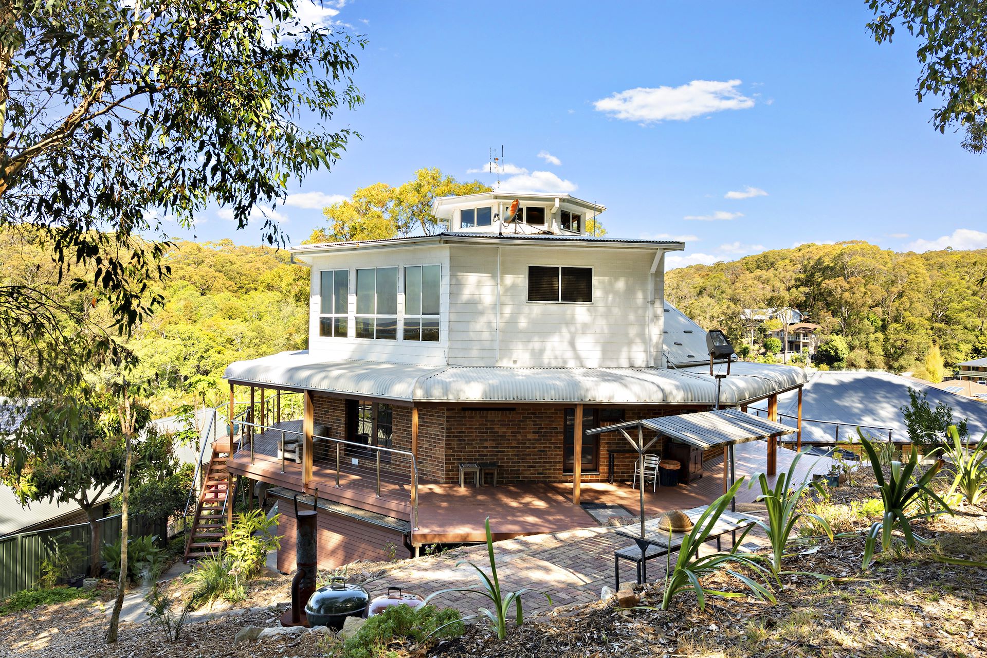 Defined by its striking octagonal tri-level design and breathtaking views, this one-of-a-kind home delivers the ultimate lifestyle package in a secluded sea AND tree-change location. Designed to take full advantage of its elevated setting and off-shore breeze, the home is cleverly laid out. Garaging, a rumpus/bar area, a study, a bedroom and bathroom are on ground level, another two bedrooms, a bathroom and impressive social zones fill the mid-level, and a spectacular top-floor mezzanine with parent's retreat including a living space is the icing on the cake. Each level is connected via a spiral staircase, ceilings soar and feature exposed Oregon beams, and a full-length verandah wraps the home's perimeter – it's truly remarkable in its design. Beautifully proportioned with spaces to retreat to or commune with family and friends, here is a home that includes every extra for the finest living experience. - Unique cul-de-sac home that could easily be a contender in the "Grand Designs" TV series - Quiet location surrounded by nature, backing onto reserve, and flaunting a view of Swansea Channel and Redhead Bluff - Three superb living spaces including a ground level bar featuring a commercial 4 tap beer system - Chef's kitchen boasts an 900mm oven with gas cooktop, Miele dishwasher and Rosewood cupboard doors - Four bedrooms including a top-floor parent's retreat with a living area and ensuite with bath - Exquisite materials used throughout, including Oregon ceiling beams, a custom bath built from Blue Gum, Cypress and Blue Gum flooring plus Italian travertine tiles, Australian Red Cedar benchtops in bathrooms and laundry - Raked ceilings, electric raised windows, wall and ceiling paneling, French doors, and huge voids enhancing spaciousness - Paved outdoor area for alfresco dining - Oversized double garage with upgraded epoxy floor, extra parking bays outside - Close to several magnificent beaches and a short walk from shops, a playground, and pre, primary and high schools - 1400m to Caves Beach Surf Lifesaving Club