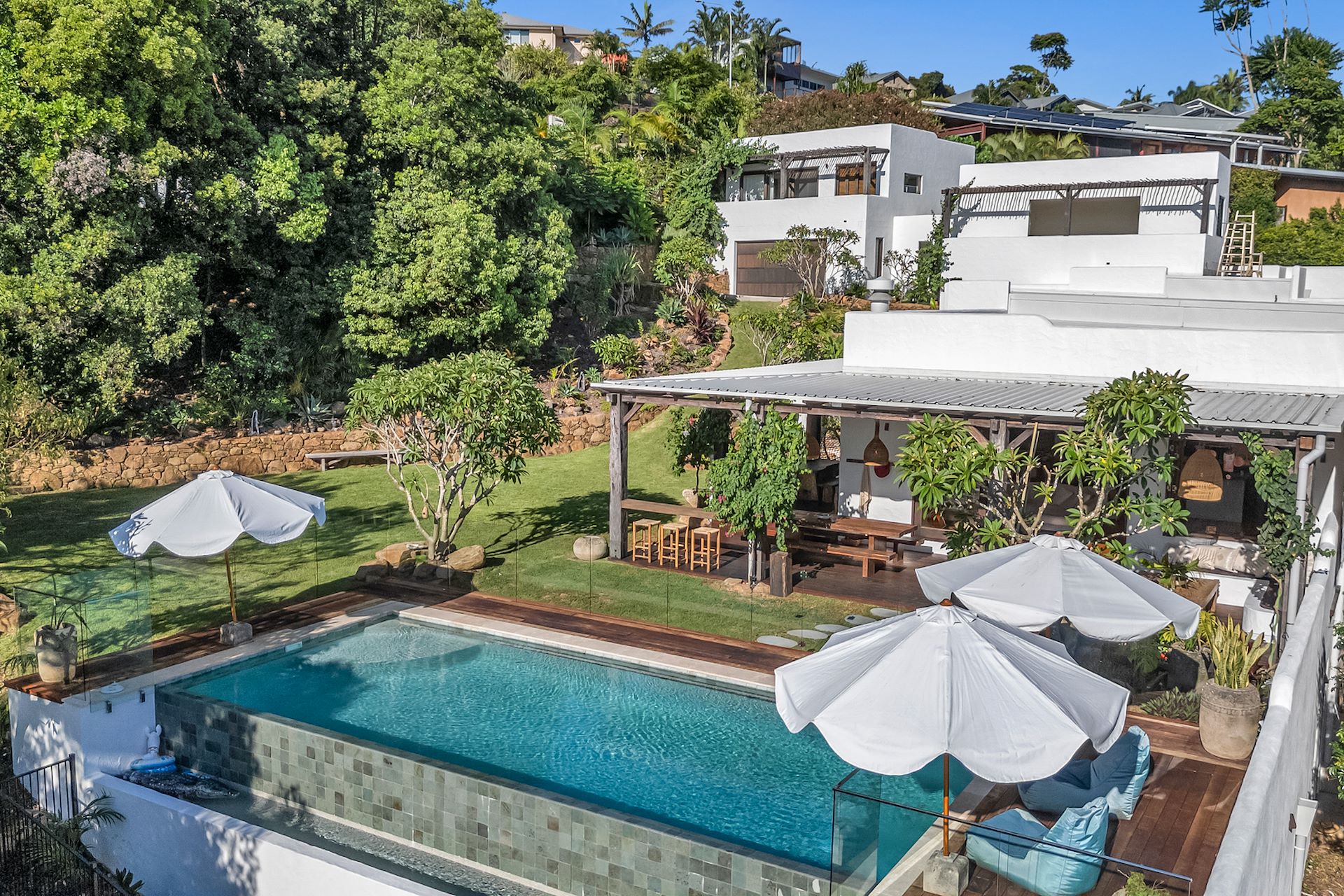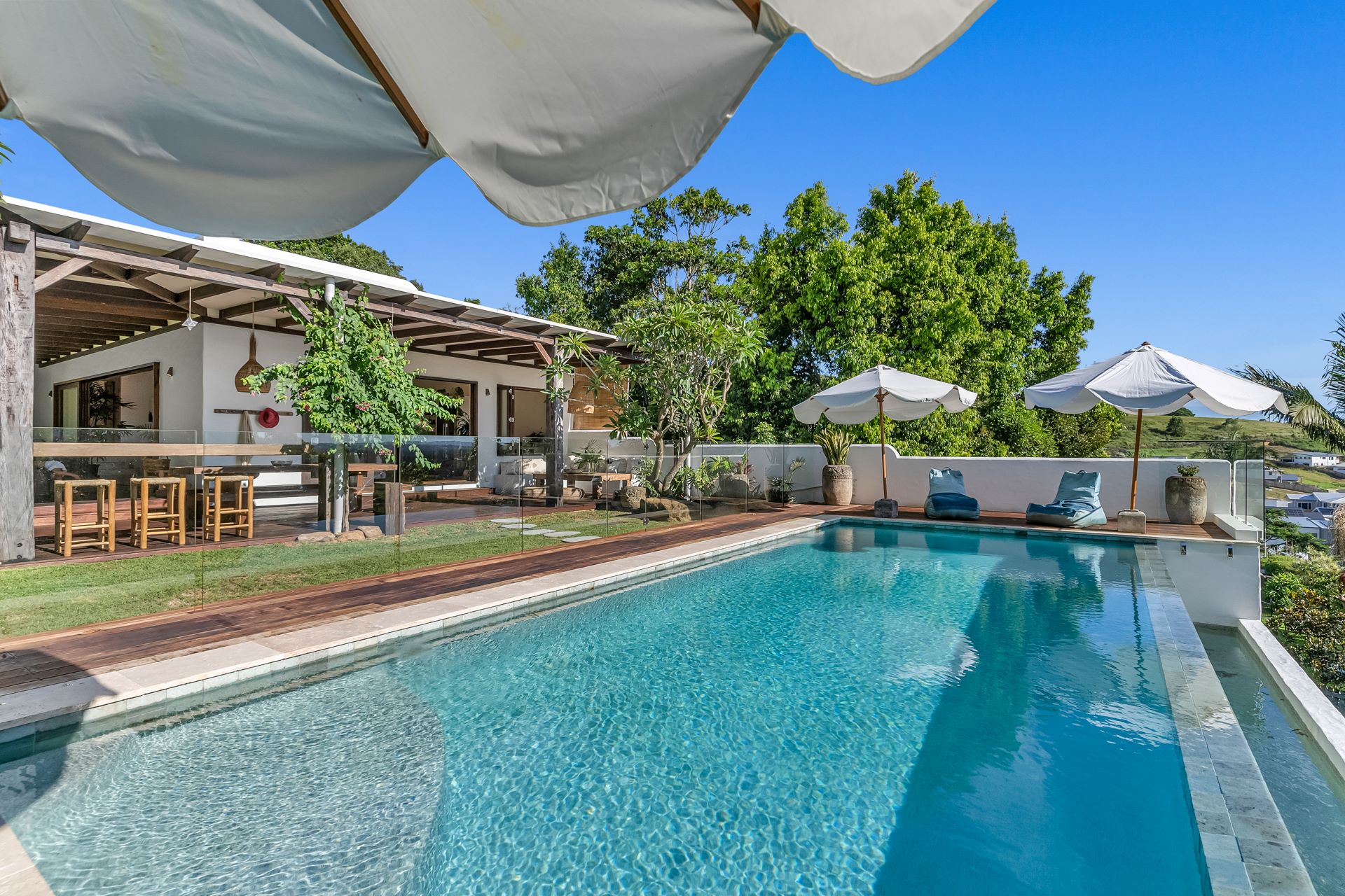 Nestled amidst the Lennox Head Hilltop, this unique retreat boasts expansive hinterland views that stretch as far as the eye can see. Step into a world of contemporary design with an open-plan layout that seamlessly blends indoor and outdoor living spaces. Marvel at the beauty of the hinterland from every corner of the house, offering a picturesque backdrop to your stay. Immerse yourself in luxury with your very own in-ground infinity pool, perfect for cooling off on hot summer days or enjoying a leisurely swim under the stars.Bask in the warmth of the sun as you wander through beautifully manicured gardens and lawns, providing the perfect setting for relaxation and outdoor activities. Featuring 2 king bedroom, 3 queen and 1 bunk room. Retreat to one of the meticulously designed bedrooms featuring travertine floors and luxury finishes, ensuring a restful night's sleep. Just a 3-minute drive away, experience the world-class surf break of Lennox Point, offering epic waves for surf enthusiasts of all levels.