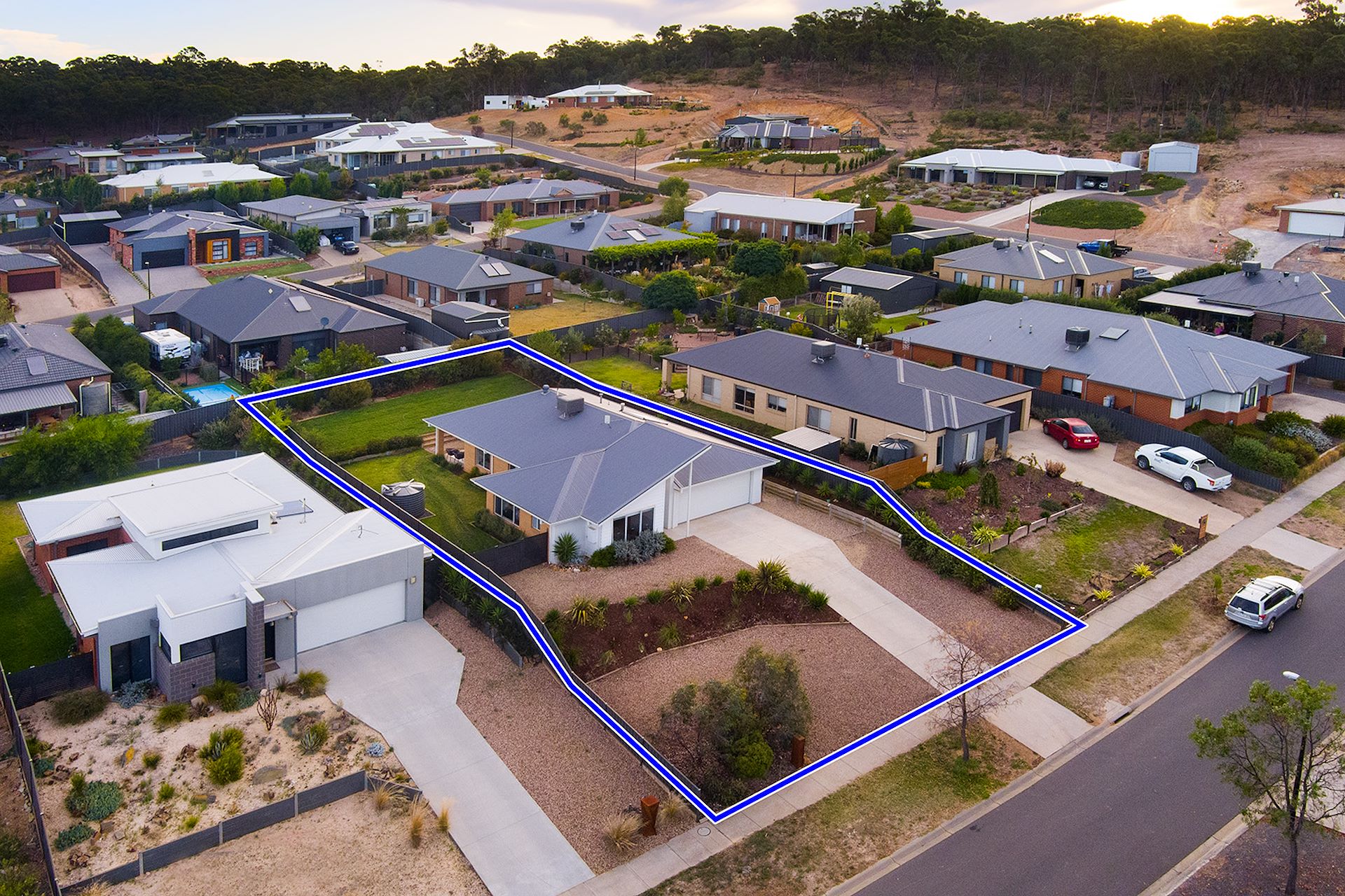 Ideally located within a 5-minute drive to Castlemaine, this lovely four-bedroom residence has an 'as-new' feel and will offer a family a comfortable, modern lifestyle. This property ticks all the boxes for a home with plenty of space and a great floor plan; it consists of four good-sized bedrooms, two living areas, two bathrooms, an entertaining alfresco area and a large rear yard. The home's façade is a standout feature with its soaring raked Colourbond roof-line. The residence is to the centre of the large 909m2 block, and there's plenty of scope to add further landscaping to the front. A pavement driveway takes you to the double-car garage with access points to the hallway and the rear yard for convenience. A formal lounge is found immediately upon entry – a lovely room with quality carpet and three considerable windows, the perfect spot to settle down with a book or enjoy a games night with the kids. Adjoining the lounge is the private master suite with a walk-in robe and ensuite. The entrance hall leads through to a spacious open-plan kitchen, living and dining area, full of natural light and garden views. The designer kitchen is a delight for entertainers and keen cooks – it features an island bench with sink, ample cupboard and drawer storage, stainless steel appliances and an excellent-sized walk-in pantry. The home feels fresh and bright throughout due to its cool neutral colour palette and modern fixtures. Quality craftsmanship and great interior design choices give the 4-year-old residence a high-end feel. The remaining three bedrooms are to the rear of the home; each includes a built-in robe and block-out roller blinds. Discover the family bathroom, separate WC, laundry, and linen press near the bedrooms. Additional features of this quality home include ducted gas heating, evaporative cooling, and solar hot water. Designed with entertaining in mind, the main living area opens to the alfresco room – a great spot to store the BBQ and enjoy many nights watching the kids or pets run amok on the lush lawn in the backyard. The yard is securely fenced on all sides and includes well-established yet low-maintenance plants and a rainwater tank; side access is also available from the front. Surrounded by other new, high-quality homes, this is an outstanding location just a short drive from Castlemaine's main shopping and dining hub, with easy access to schools, kindergarten, childcare and aged care options.