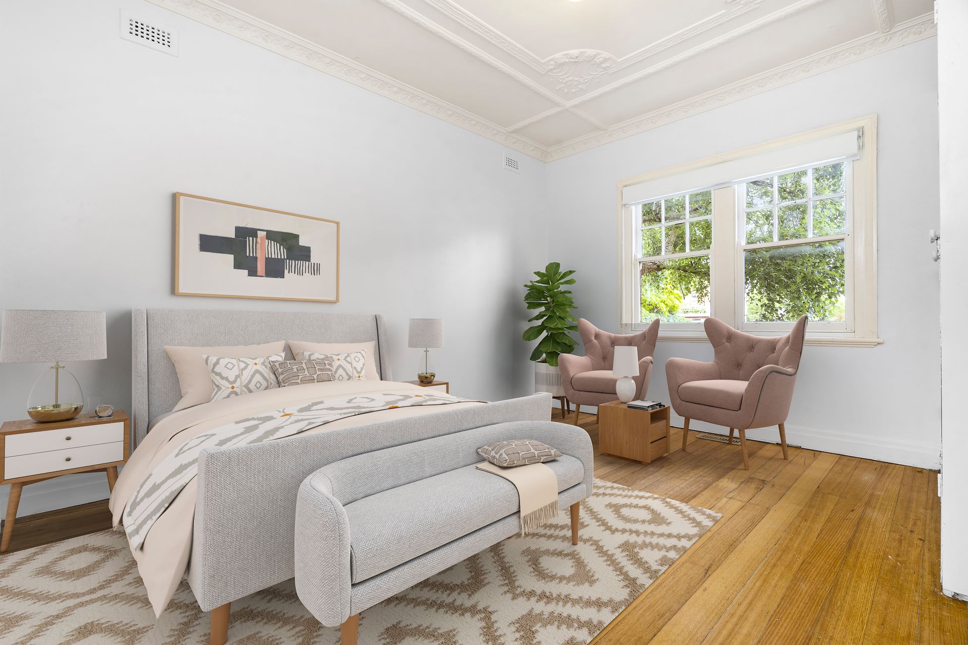 Perfectly positioned, this bright and secure two bedroom art deco apartment is the charm of its era with all the comforts of today. This sensational ground floor brick property is situated in a quiet street in a boutique block of only four set in a traditional garden setting. Comprises: Fully equipped kitchen, intercom entry, entrance hall leading to a well proportioned living/dining room with open fire place and polished floorboards, two bedrooms (master bedroom with large built in robes), bathroom with shower over bath, , and ample storage. Recently freshly painted throughout, this property is further complimented by Art Deco features ie: high ceilings, original polished floor boards, gas ducted heating and not to mention a delightful rear communal garden and shared laundry room.