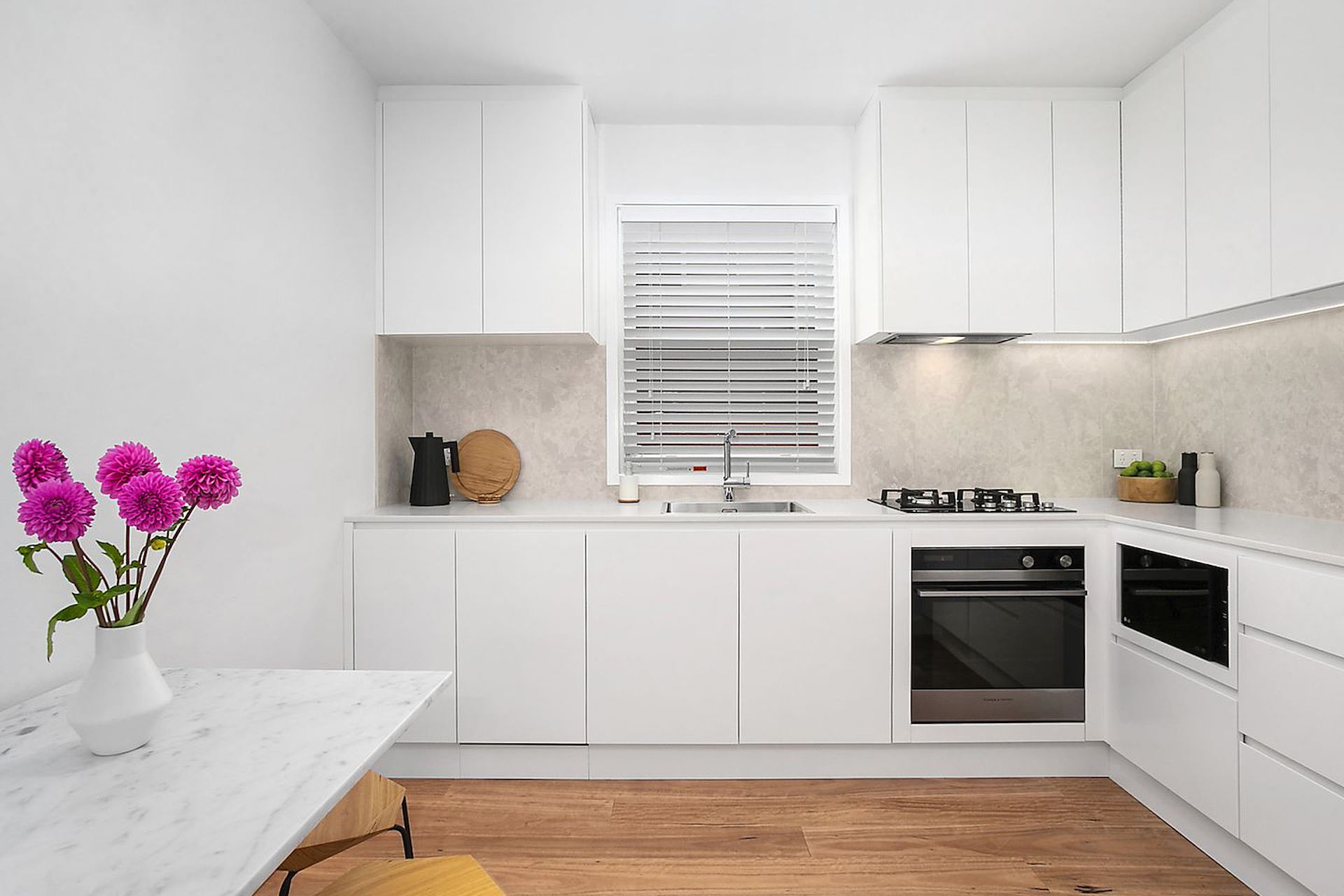 Newly transformed by a smart interior renovation, this apartment is a contemporary residence of sleek finishes, abundant natural light and effortless everyday comfort. It's in a boutique complex of only six homes, a stroll to Clovelly Beach and Gordons Bay. - Freshly presented interiors welcome with a designated lounge - Brand new gas equipped kitchen features CaesarStone benches - Smeg/Fisher & Paykel appliances include integrated dishwasher & fridge - Two north east facing bedrooms enjoying wonderful sun all day - Pristine bathroom well appointed with a glass framed shower - Plantation shutters and floating timber floors throughout - Ceiling fans and linen storage plus only one common wall - Shared laundry plus a ground floor car space - Elevated ground floor position in a secure intercom building