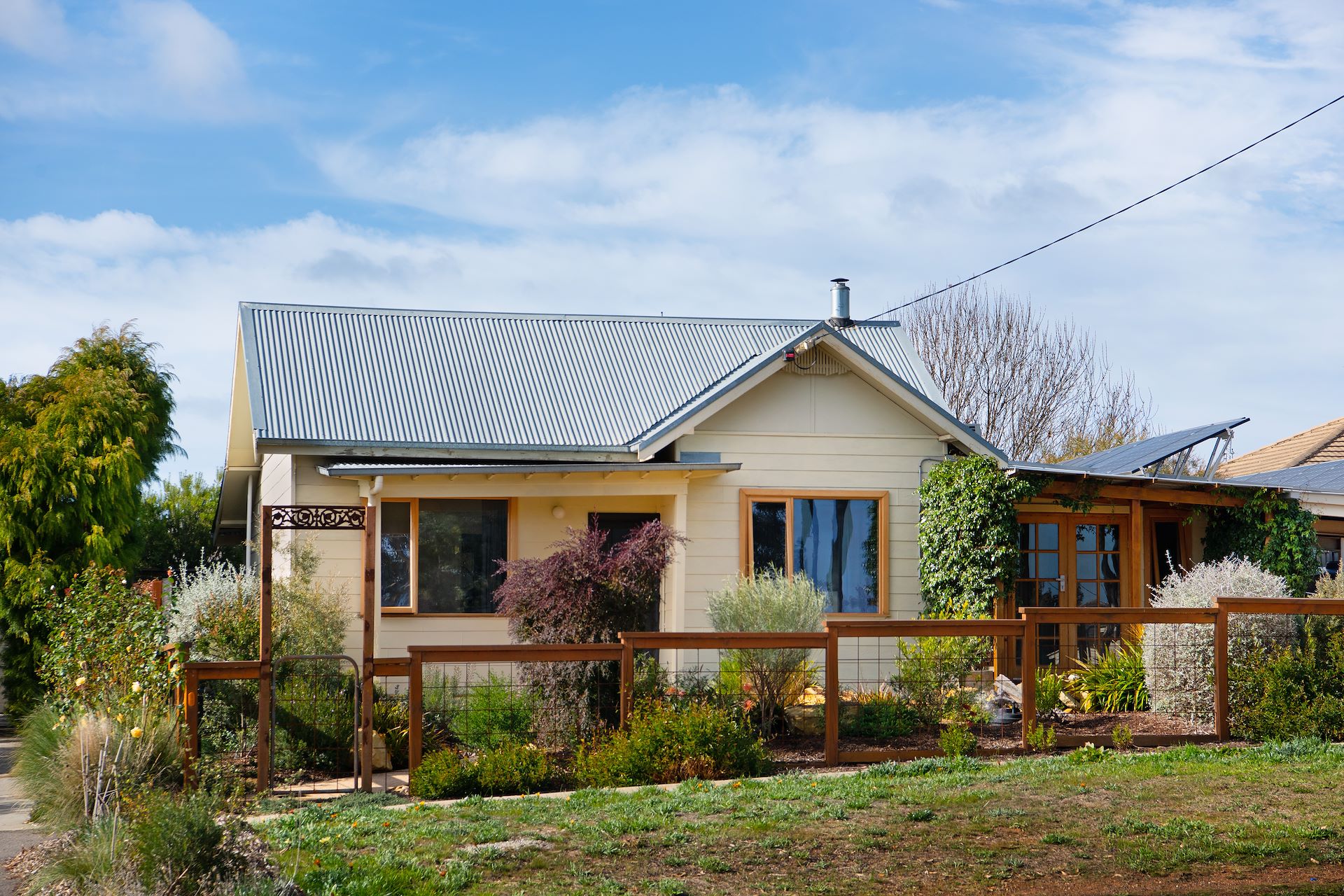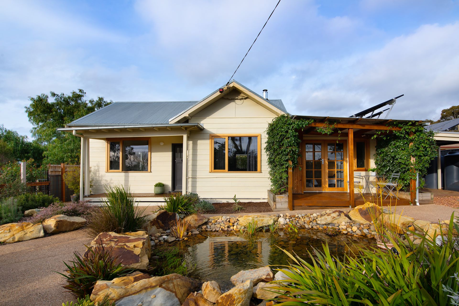 Wake up to the sound of birdsong, at 39 Wheeler Street you can immerse yourself in a modern lifestyle entwined with the best of nature. From the moment you step in the front gate it's clear that meticulous planning has gone into this home. - The landscape design features established & irrigated gardens, exposed aggregate pathways, ample rain water storage and the pure keystone of the garden– the pond – anchoring the outdoor and indoor spaces. - There are cosy decks and private sitting areas set up to enjoy this wonderful outlook. - The cottage comprises of three bedrooms, the main boasts a walk in robe and private ensuite, while the 2 further bedrooms could also be set up to work from home. - Spaces have been designed to invite the natural light in and the main living area flows through to the French doors and private brick paved courtyard. - The u-shaped kitchen has practicality in mind, equipped with a gas cook-top and modern finishes, and the main bathroom incorporates laundry. - Other highlights include polished floorboards throughout, updated double glazed windows, air-conditioner, Nectre wood heater and 6kw solar power. - Situated an easy 10 minute stroll to the centre of town and the train station. The house sits on a small but mighty 426m2 block with off street parking and large carport at the side, there is room to expand the homes footprint or simply enjoy the benefits of work already done. If you are looking to settle down in central Castlemaine or are a savvy investor wanting to add to your property portfolio – this property has many opportunities.