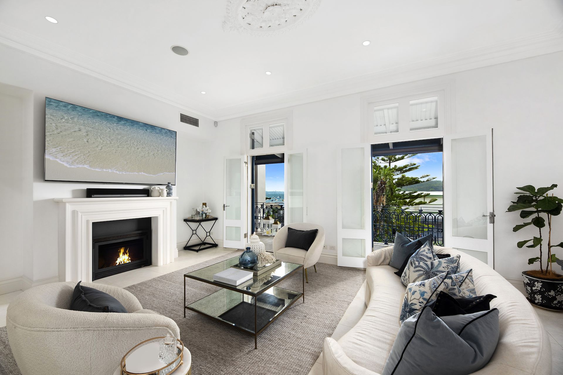 An iconic landmark residence of unrivalled elegance, sophistication, and style. A truly magnificent and exclusive lifestyle residence, this meticulously restored c.1871 Victorian terrace enjoys pride of place on the harbourfront directly opposite the pristine beach at Manly Cove and Manly Wharf. Exclusivity meets designer luxury over three lavishly appointed levels of majestic living spaces and spectacular harbourside alfresco spaces with mesmerising views of yacht-sprinkled harbour scenes. One of Sydney's most prestigious coastal lifestyle residences, it is within footsteps of Manly Wharf and Manly's world-famous ocean beach and lifestyle hub. - Elaborately rendered facade with high arched windows set behind a palisade fence - Grand entrance foyer, soaring rosette ceilings, and heated limestone flooring - Lounge room with gas log fireplace, sandstone courtyard, and synthetic lawn - Generous living space with tall arched windows revealing sparkling harbour views - Dining room with built-in bar, cabinetry, wine racks, and tranquil central courtyard