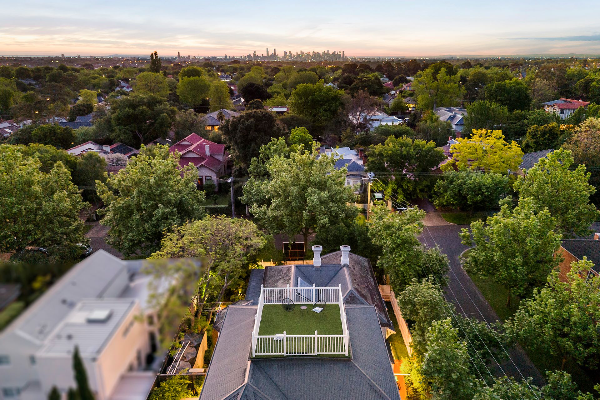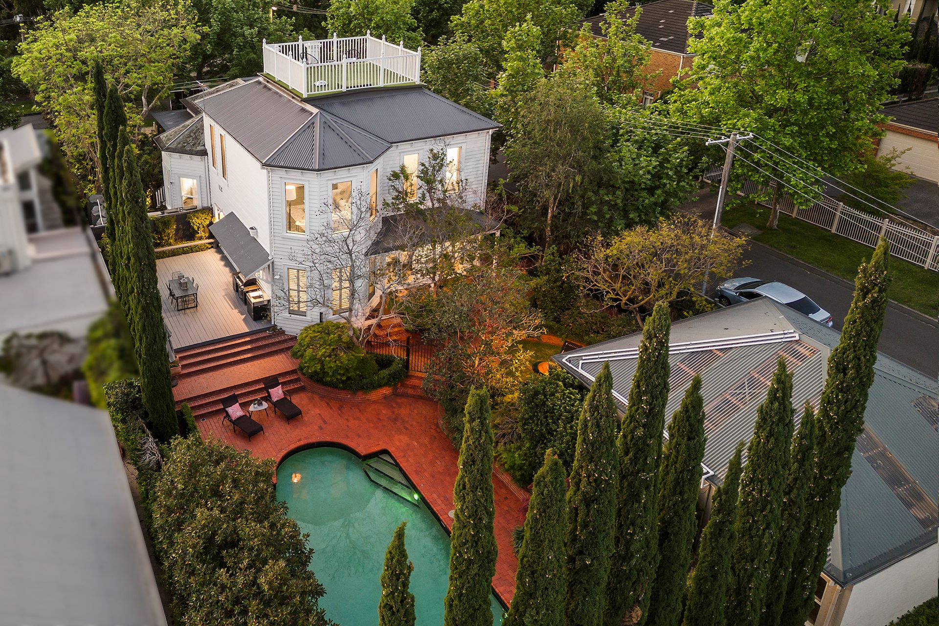 INSPECT BY APPOINTMENT Enviably set in the highly regarded English Counties Estate, this elegant and stunningly renovated 5-bedroom Victorian residence captivates with its gracious street presence, welcoming interiors, and lush landscaped gardens with swimming pool. Introduced by a return veranda and leadlight entrance, the inviting interiors reveal soaring ceilings and period features; there are three amazing separately zoned living spaces: a refined formal sitting room with fireplace and bay window; an open plan living and dining domain with gas log fire and French doors to the rear veranda; along with an outstanding upstairs children's retreat/media room. Upstairs an attic ladder leads up to a sensational rooftop terrace offering mesmerising 360-degree uninterrupted views to Port Phillip Bay and the Dandenong's from one of the highest points in the Eastern suburbs. The superbly appointed gourmet kitchen boasts stone benchtops and Swiss made V - ZUG appliances with ample storage, well-equipped for large family gatherings. The oversized bedrooms and home office/ zoom room accommodate the perfect working from home environment whilst the beautiful main bedroom featuring ensuite and walk in robes, open fire and bay window. The informal living spaces open to peacefully private northeast facing gardens with large entertaining deck featuring plumbed BBQ/kitchen, veranda, and sumptuous swimming pool ideal for family enjoyment. Additional appointments include 3 bathrooms, a fitted laundry with drying room, quality engineered timber flooring, smart home system with keypad entry and alarm, gas heating, air-conditioning, water tank and garden irrigation system. A double garage and versatile workshop/studio add further appeal to this superbly positioned home in one of the area's most beautiful streets, close to village shops, popular cafes, train station, Riversdale Road trams, Canterbury Primary School, Camberwell High School and leading schools nearby.
