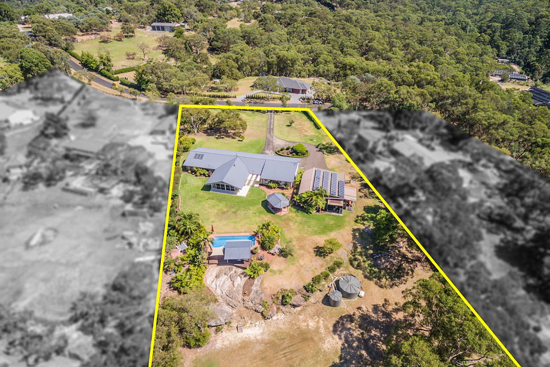 Modern family style and acreage serenity define this recently renovated residence where flowing living spaces, large arable land areas and outstanding quality combine to create an impeccable lifestyle home. Nestled on a very secluded five acre landholding, it offers the epitome of blissful privacy with substantial proportions and relaxing bushland views. The home also provides an entertainers' paradise in a great location with easy access to the Rouse Hill town centre and future train station, Annangrove amenities, schools and nearby nature reserves. -Expansive useable areas ideal for horse facilities or a tennis court -Spacious open plan 'great room' and beautiful kitchen with butler's pantry -Fully fenced level house yard with sheltered patio and swimming pool -Five double bedrooms, study, formal lounge and separate living room -144sqm shed with mezzanine level, three-phase power, workshop and solar power -The property is Home Industries DA approved for business use