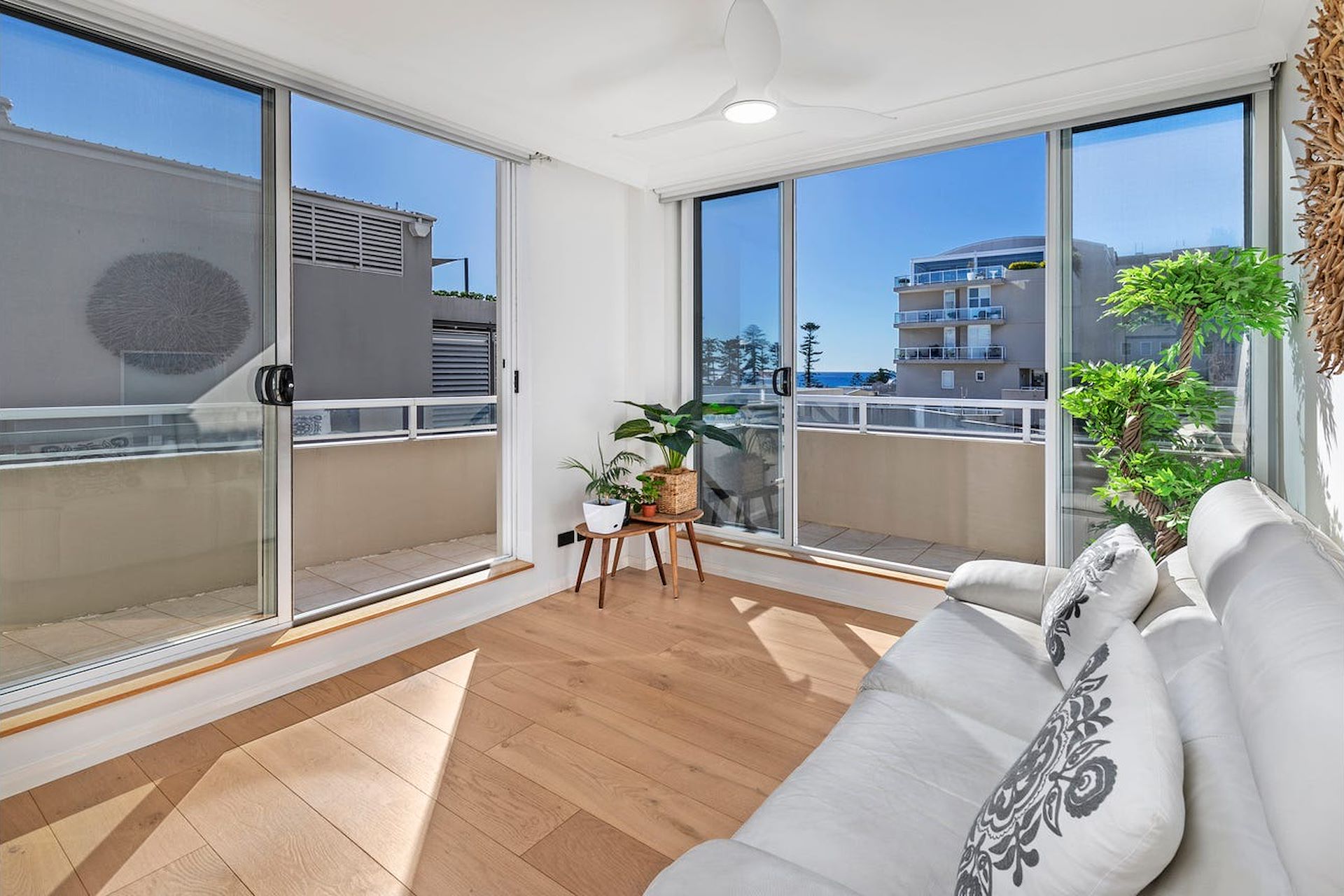 Sunlit 'Peninsula Harbourside' Renovated Apartment with Ocean Views Only footsteps to Manly Beach, renowned restaurants and cafes, Manly Wharf, city ferries and excellent shopping, this quiet north east corner apartment enjoys an ocean view position on the top floor of 'Peninsula Harbourside' in the heart of Manly. Designed for those who embrace a carefree beachside lifestyle, but with the essential luxuries close at hand, the apartment is bright and airy throughout and offers low maintenance, resort style living in a celebrated coastal setting. - Renovated gas kitchen with AEG appliances, inclusive of dishwasher, breakfast bar and stone benches - Open plan living area, free flowing through glass sliders to your alfresco entertaining balcony - Central bedroom with a custom built in robe and private access to the balcony - Renewed chic bathroom with underfloor heating and a separate renovated internal laundry - Plentiful storage with bespoke cabinetry upon entering the residence, ducted air conditioning, timber flooring, remote block out blinds, ceiling fans - Dedicated secure parking space with storage box over the car space - Partly furnished offering including: Washing machine, dryer, fridge, queen bed base, lounge & kitchen bar stools - Sorry no pets The landmark security building provides residents with lift access and exclusive facilities to a rooftop heated pool, upgraded gymnasium and shared rooftop BBQ and entertainment areas. 'Coles' is literally five steps from the front entrance so shopping is a breeze.