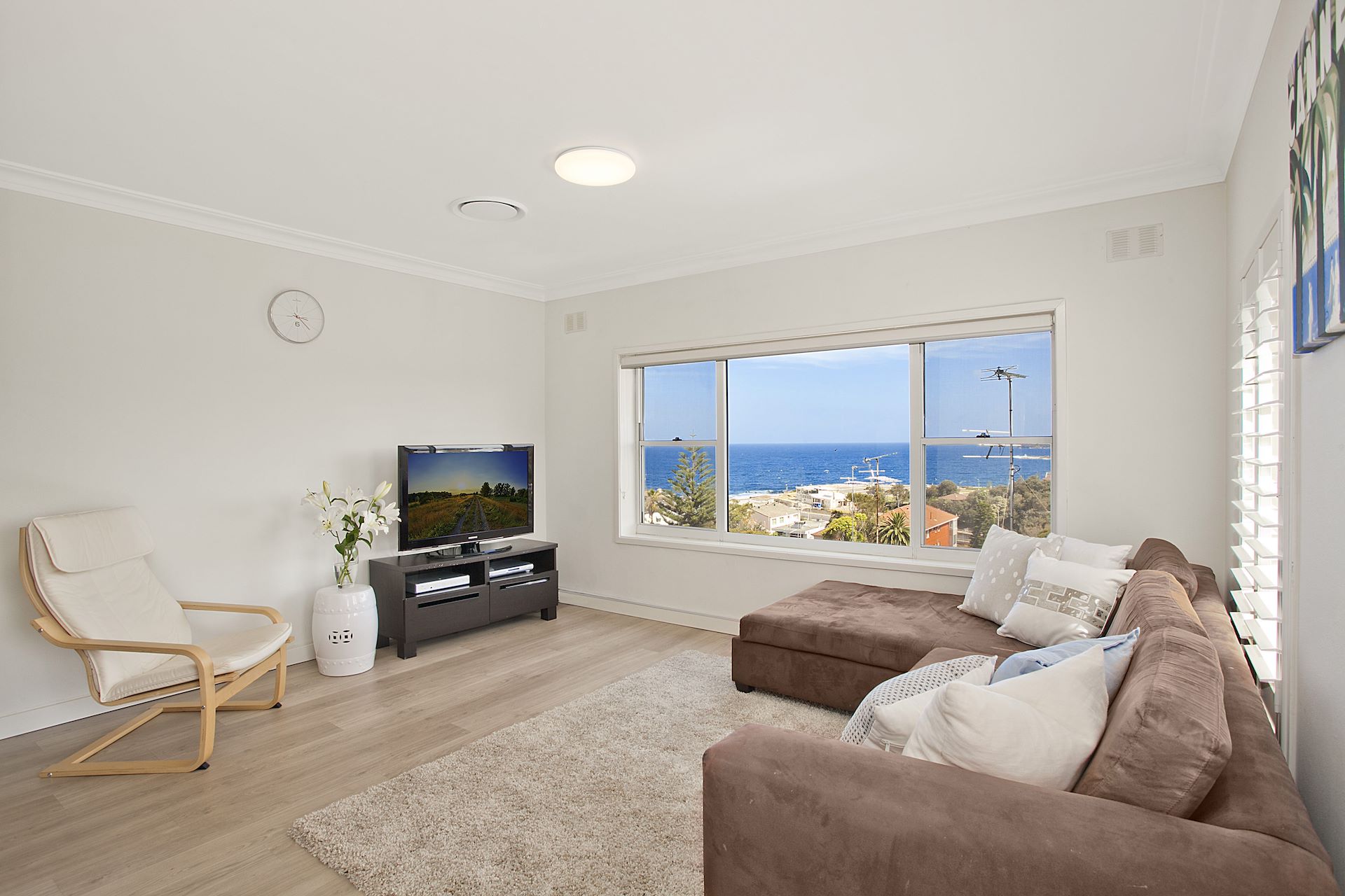 Lifestyle - Sweeping ocean views over Wedding Cake Island to Maroubra Headland create a breathtaking backdrop to this recently renovated beachside apartment. Occupying a prized top floor position in a well-maintained boutique block, it's positioned on one of Clovelly's best streets just 100m to the steps leading down to the beach. Taking design cues from its coastal surrounds, it offers a wonderful sense of peace and privacy with bright and airy interiors wrapped in windows on three sides. Accommodation - Freshly schemed interiors feature two double bedrooms with built-in robes including a king-sized main bedroom, an open layout with fluid living and dining areas, oversized windows framing the ocean views, a breezy balcony, streamlined designer CaesarStone kitchen with integrated European appliances and glass splashbacks and a stylish white-tiled bathroom with a bath and rainwater shower head. Features - Set in a block of nine with landscaped common gardens and a barbecue terrace, this sun-filled apartment features ducted reverse cycle air for year-round comfort, plantation shutters, new lighting, FoxTel, an internal laundry plus use of a shared laundry room and only one common wall. Surrounded by marine parkland and just a short stroll to the coast walk to Bondi, it's perfectly located to enjoy a relaxed beachside lifestyle.